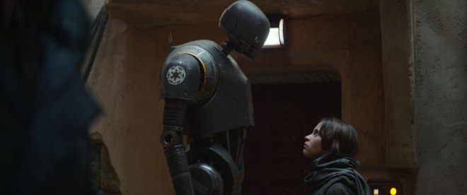 Anyway, it turns out one of those rebels, Jyn Erso wasn’t much of a rebel as so much the daughter of Galen Erso, the designer of the Death Star, because this is Star Wars and everyone in the Star Wars universe has father issues. Anyway Galen sends his daughter a message about getting the Death Star plans, and so she goes off to steal them with a rag-tag group of rebels, including a blind Monk, a defected pilot, some non-speaking cannon fodder, and a wise-cracking robot.